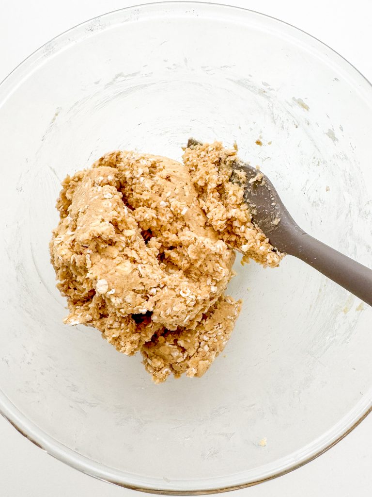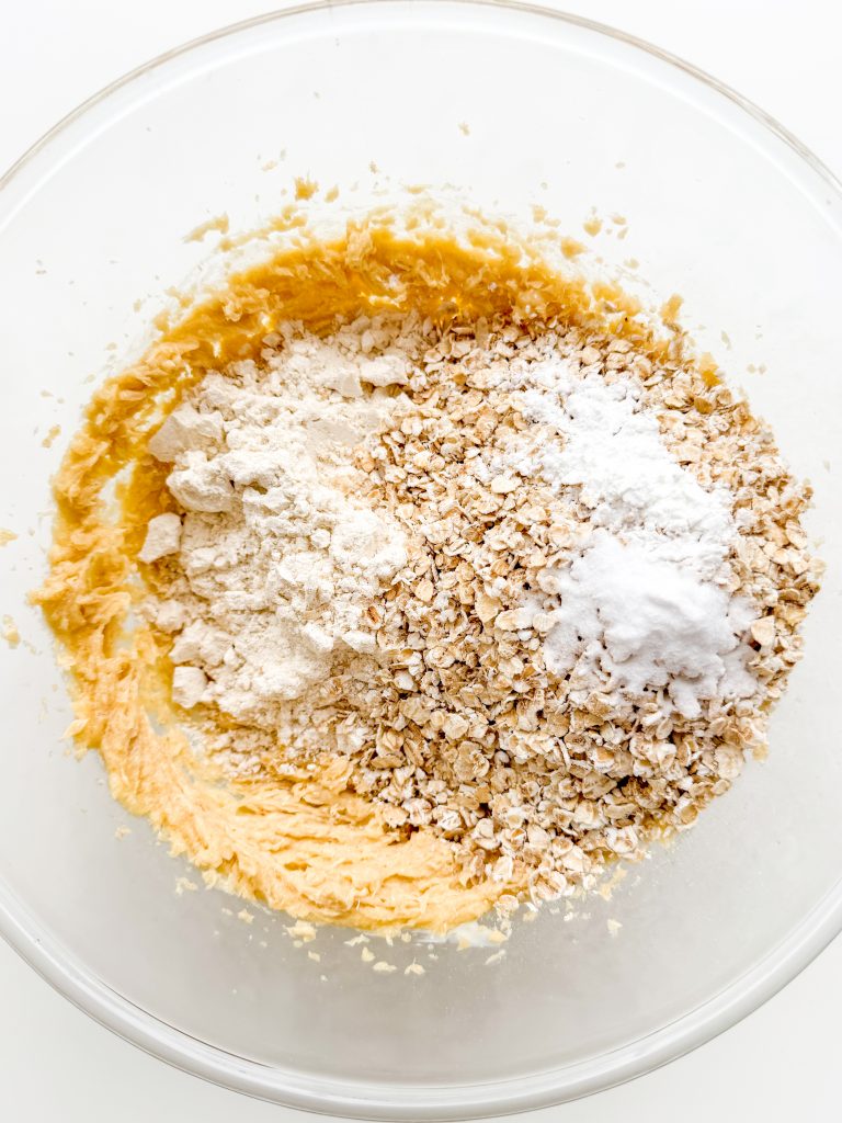 - Weigh in the dry ingredients: the oats, flour, baking powder and bicarbonate of soda. Fold in, until evenly mixed, being careful not to over-mix.