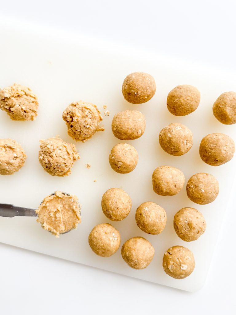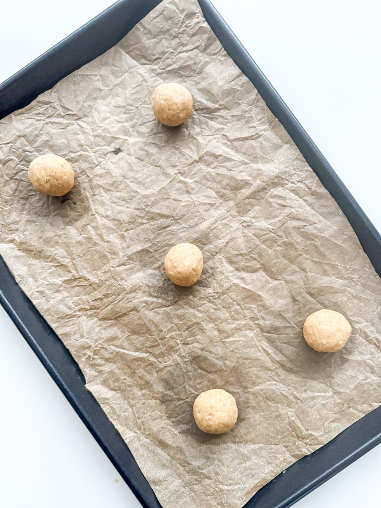 Use a 15ml tablespoon to measure the biscuits. You should make around 25 – 27. Roll in your hands to create neat ball shapes. Place spread out on baking parchment lined baking trays. I bake 5 – 6 per tray.