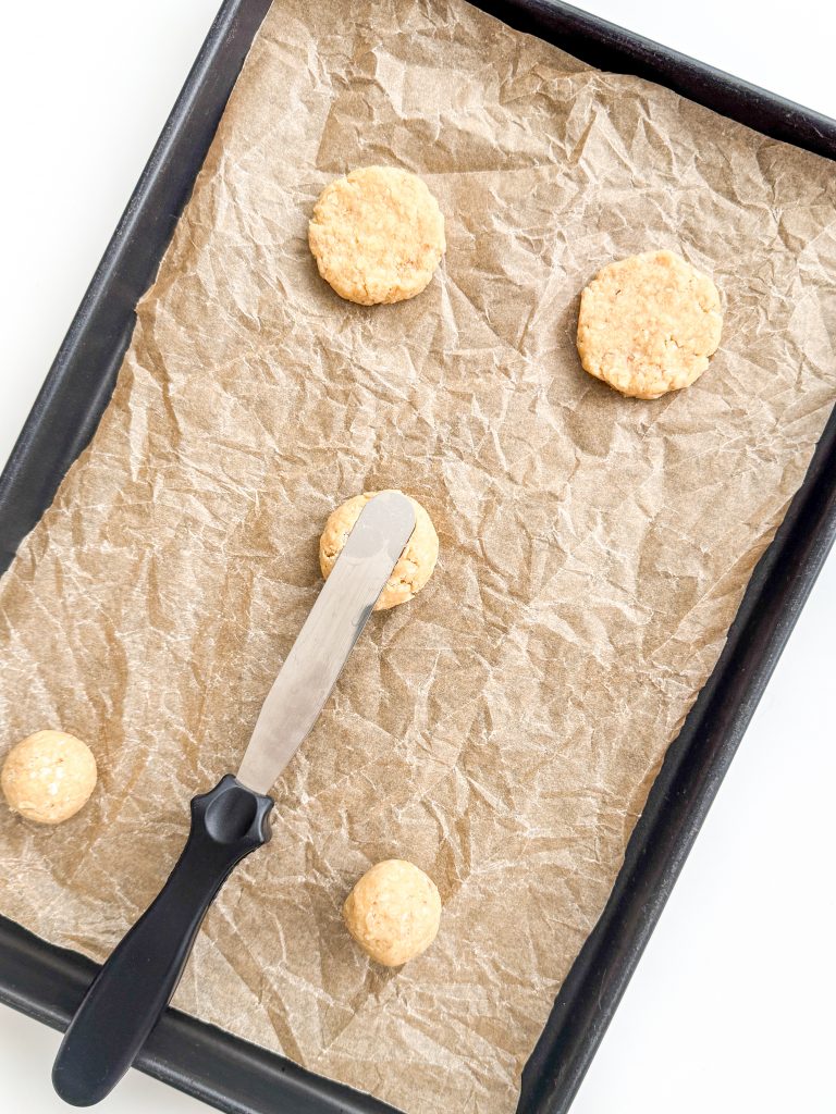 – flatten the balls with a palette knife, neaten the edges and bake for 10 – 12 minutes, or until golden brown. Leave on the tray for 15 minutes and then transfer to a wire rack to cool.