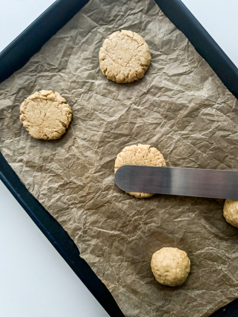 - bake the balls in the centre of a pre-heated oven for 6 minutes, remove from the oven, flatten the balls with a palette knife and return to the oven for a further 5 – 6 minutes, or until golden brown. Flattening mid-bake will give you a thinner biscuit than flattening prior to baking.