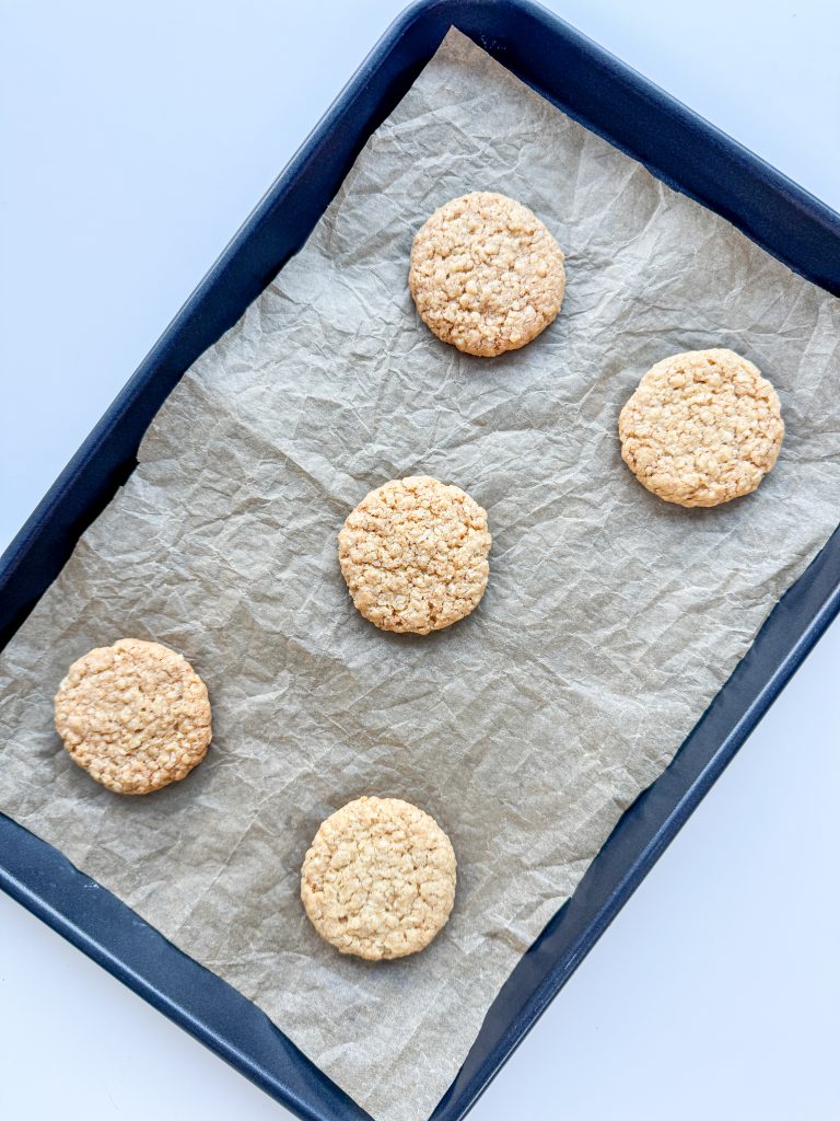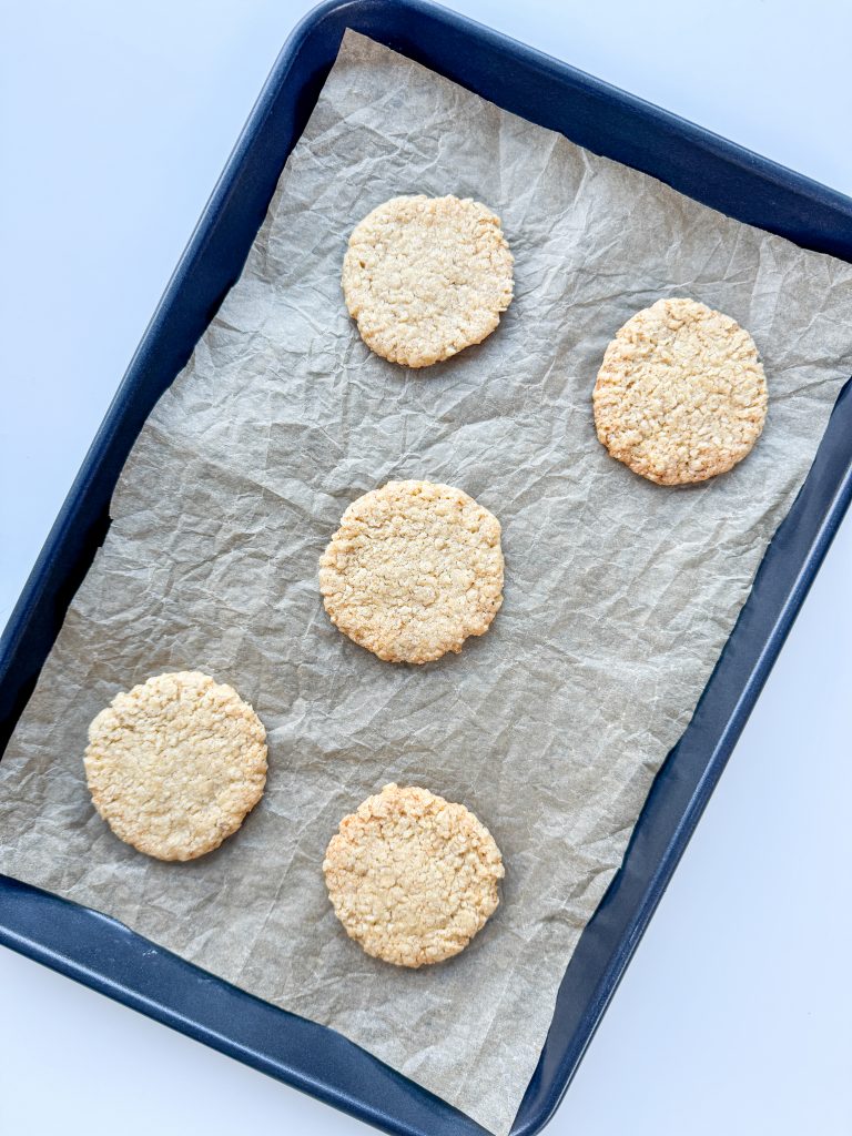 – bake the balls in the centre of a pre-heated oven for 6 minutes, remove from the oven, flatten the balls with a palette knife and return to the oven for a further 5 – 6 minutes, or until golden brown. Flattening mid-bake will give you a thinner biscuit than flattening prior to baking.