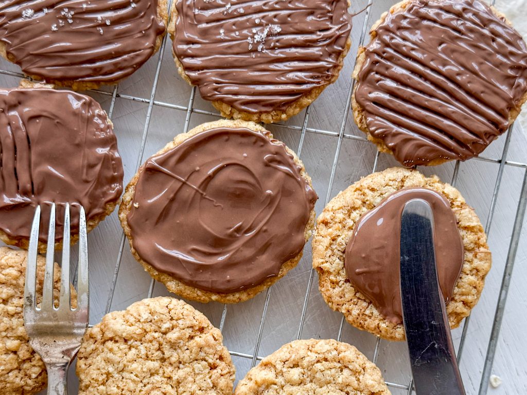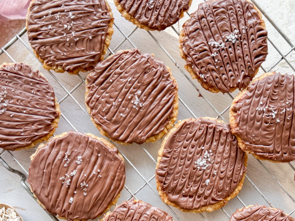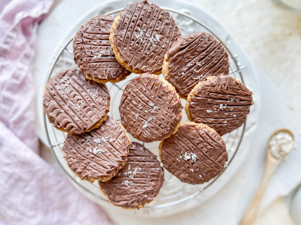 - Spread a layer of chocolate on the biscuits and leave to set a little for a few minutes. Use a fork to mark some lines in the chocolate and sprinkle a tiny pinch of sea salt flakes on each biscuit. Set aside to fully set.