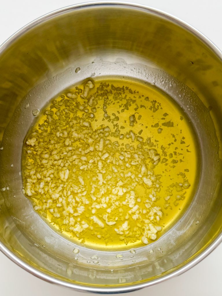 - Measure 2 tablespoons olive oil into a saucepan over a moderate heat and add the crushed garlic. Cook for 1 minute and remove from the heat. It is important that the heat isn’t too high or the garlic will burn. You just want it to be aromatic.