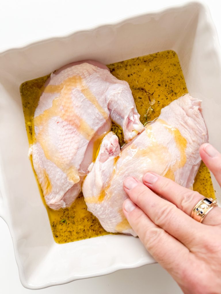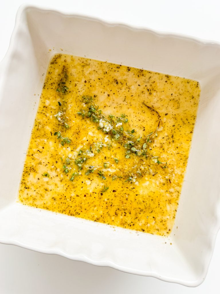 - Next add the white wine, lemon zest, lemon juice, oregano, thyme, salt and pepper. Pour into a baking dish. The dish I use for 2 good sized chicken supremes/breasts is 20cm/8in square. NB If your baking dish can also be used on the hob, you can heat the oil and garlic directly in the baking dish. A cast iron pan would work wonderfully.