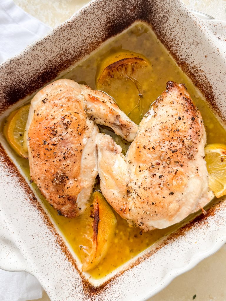 Succulent, moist, supremes of chicken, are cooked nestled in a bed of lemon, garlic, herbs, white wine and olive oil. The skin is simply rubbed with olive oil and seasoned purely with sea salt and freshly ground black pepper to guarantee a crispy skin with pops of salty, peppery deliciousness. Whilst in the oven, all the incredible flavours are absorbed directly into the flesh from the lemon and garlic mixture below and the oil and wine guarantee that the breast maintains its juicy and moist texture. With only 5 minutes needed to prep, this stand-out chicken dish is quick and easy enough for a weeknight supper, but also perfect for entertaining. I like to serve this luscious chicken on a bed of silky, mashed potato with the juices from the pan and some green vegetables on the side.