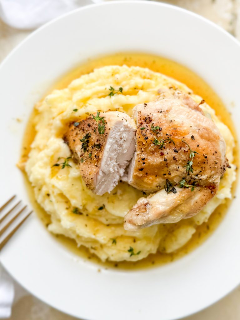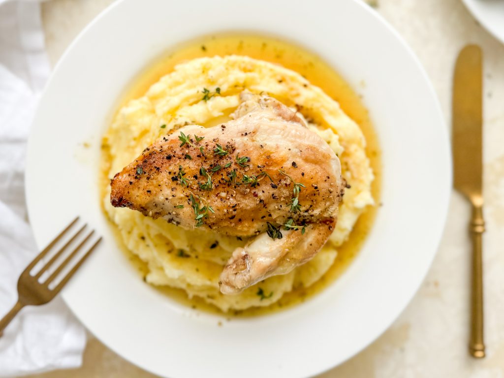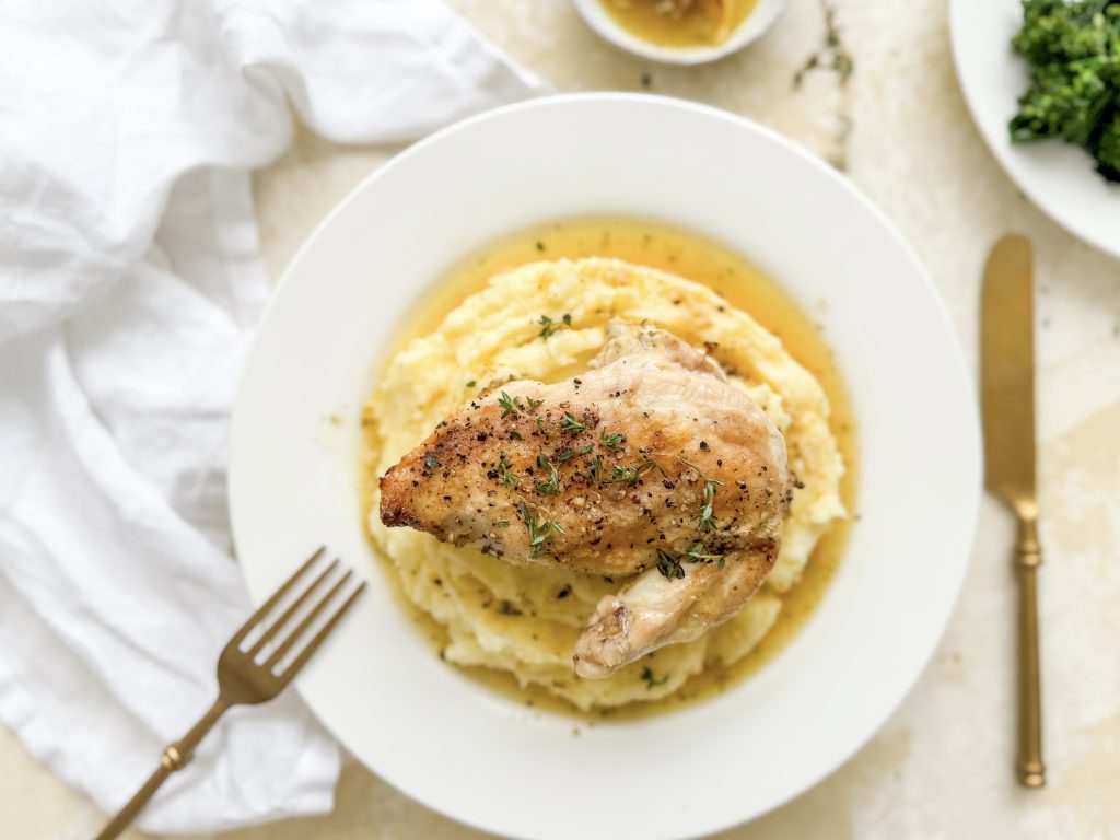 - Serve with the pan juices, silky mashed potatoes and some green vegetables or a green salad on the side.