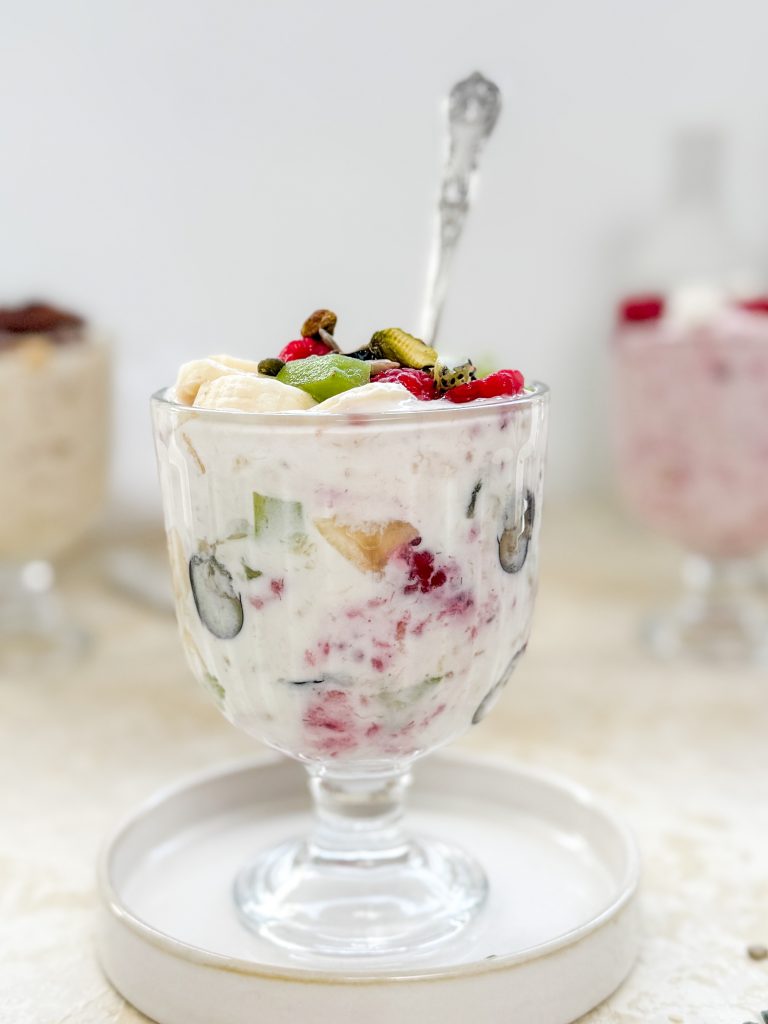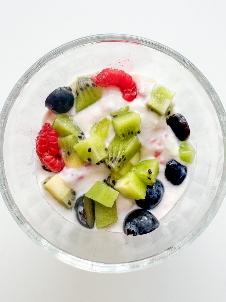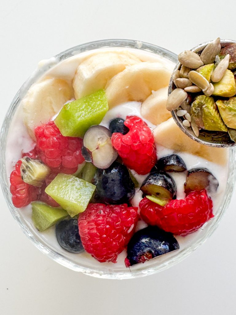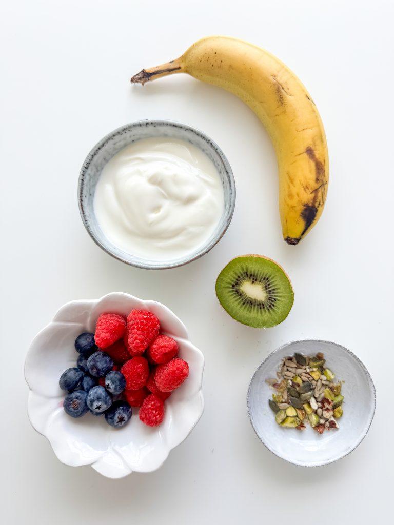 Rich and creamy yogurt, naturally sweetened with banana and served with a wonderful cocktail of fresh fruit. This moreish, healthy and nutritious recipe can be served for breakfast or a wonderful dessert. Serve just as it is or try topping with some chopped, crunchy nuts and seeds.