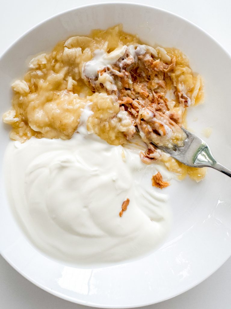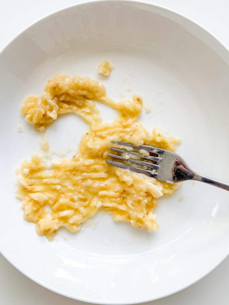 - mash ¾ of the banana until very soft. Add the yoghurt, mix thoroughly and push to one side of the bowl.