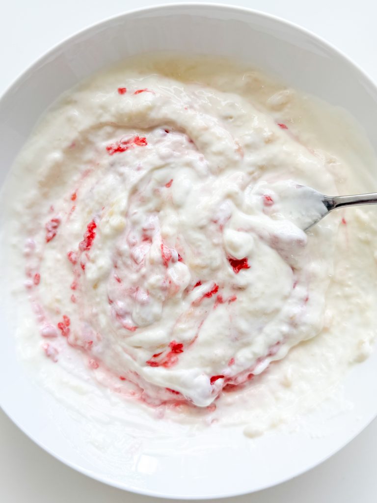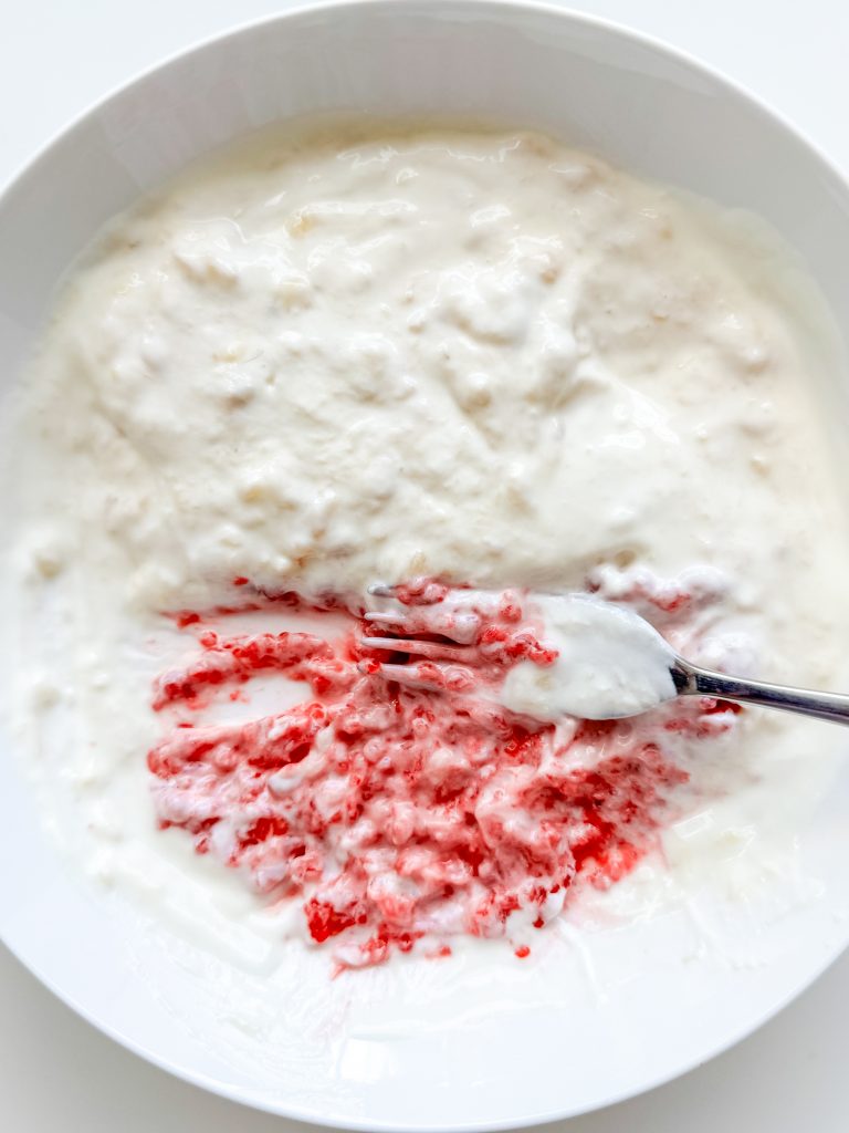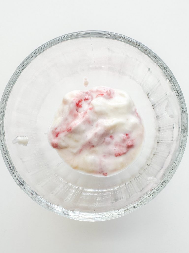 – add 25g raspberries and also mash. Swirl these through the yoghurt, so it has a rippled appearance.
