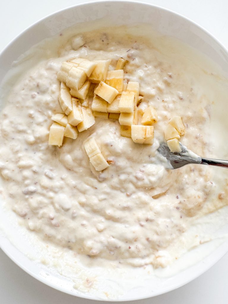 - top with ⅓ of the chopped fruit. Repeat two more times, adding the banana slices to the top as well.