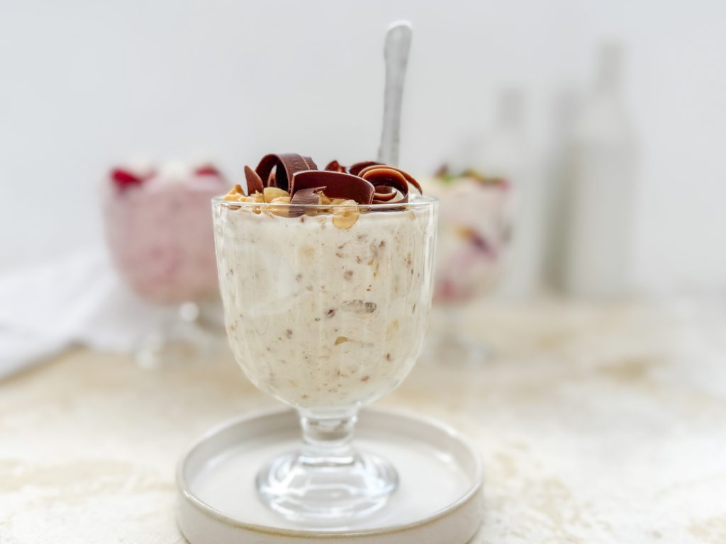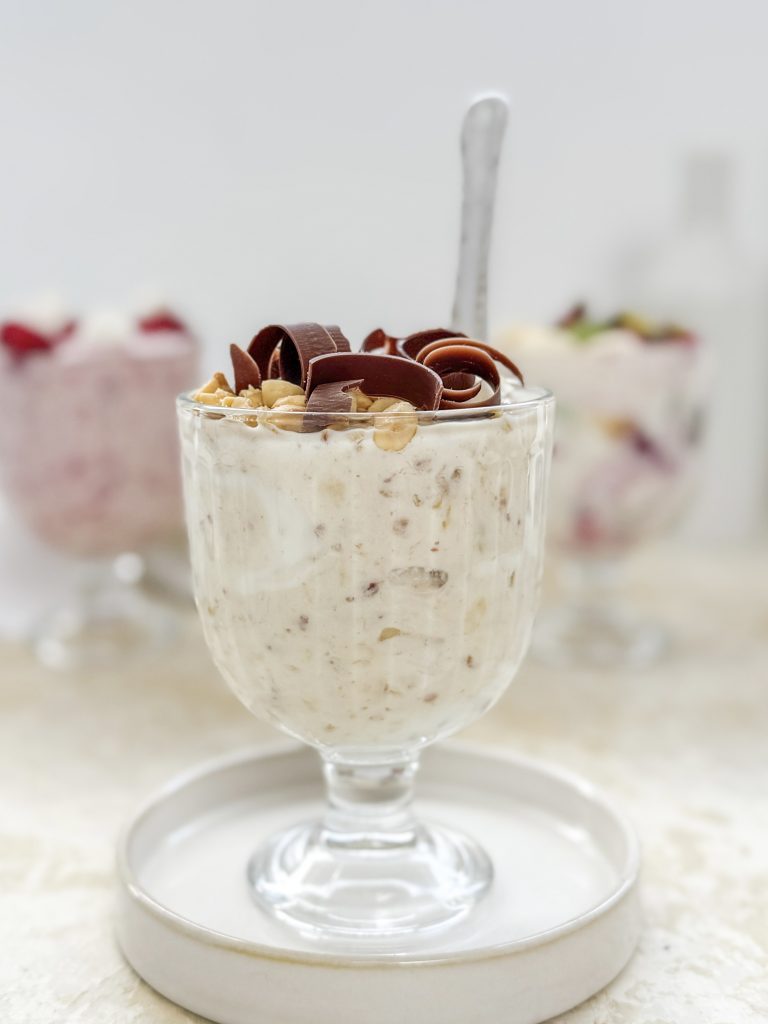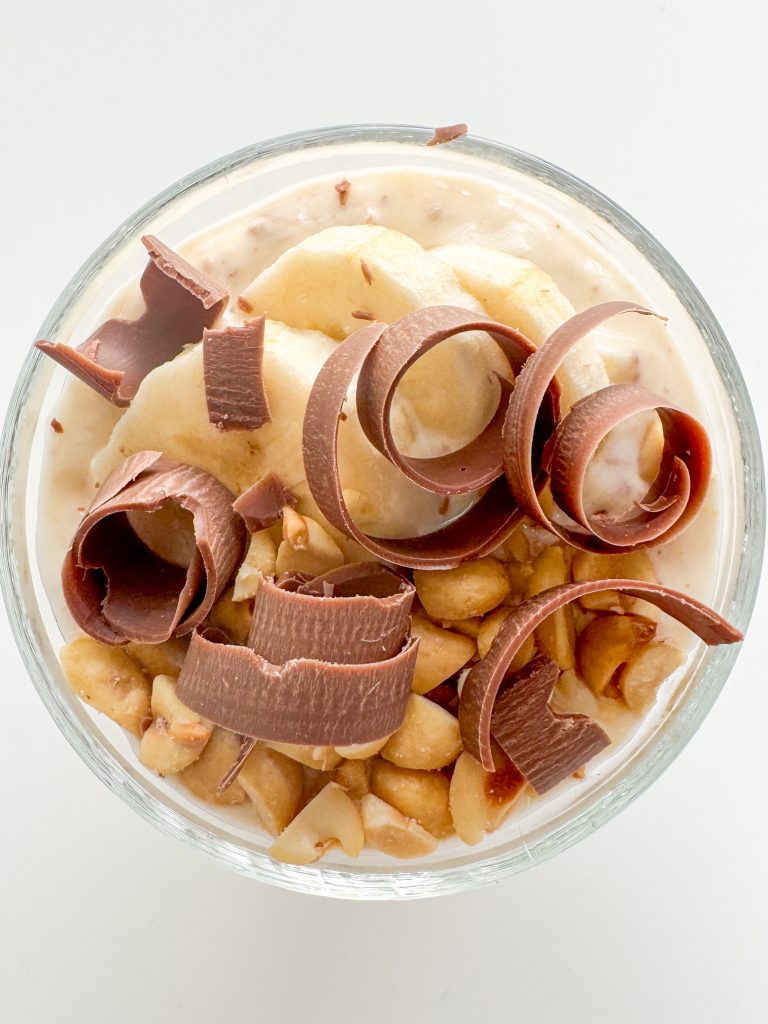- Transfer to to a serving dish/glass. Top the yoghurt with the remaining banana, sliced, some chopped, salted peanuts and curls of chocolate.