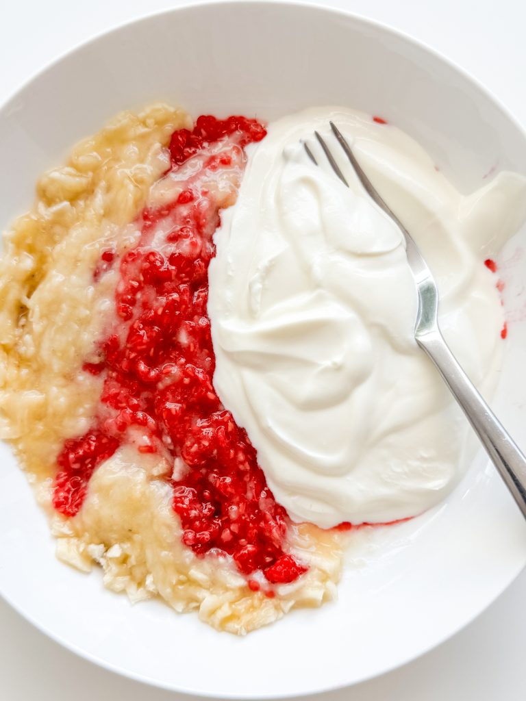 Your banana should be quite ripe – the skin should be dark yellow with lots of black spots. These bananas will be beautifully sweet and you shouldn’t need extra sweetener. However, if you have a very sweet tooth, you could add a touch of honey or maple syrup. Furthermore, ripe bananas have softer flesh, they mash more easily and become quite creamy, adding to the silky yoghurt.