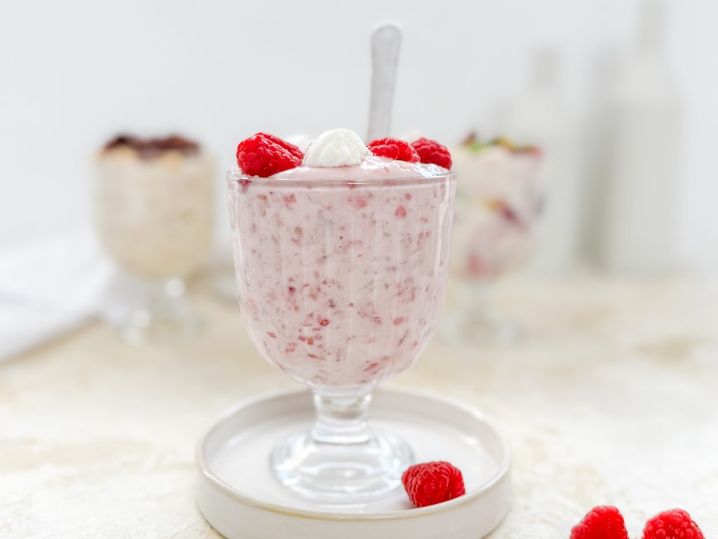 If you are looking for more of a treat, mash some sweet raspberries into the banana yoghurt and crush in crispy meringue. This sweetens the beautiful pink yoghurt and adds texture, but eat it straight away for the crunch. Top with raspberries, extra crushed meringue and serve for dessert.
