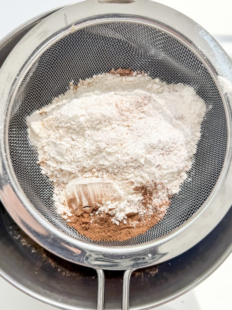 - Sieve the flour, baking powder, ginger and cinnamon powders into the saucepan and combine, until nearly mixed in.