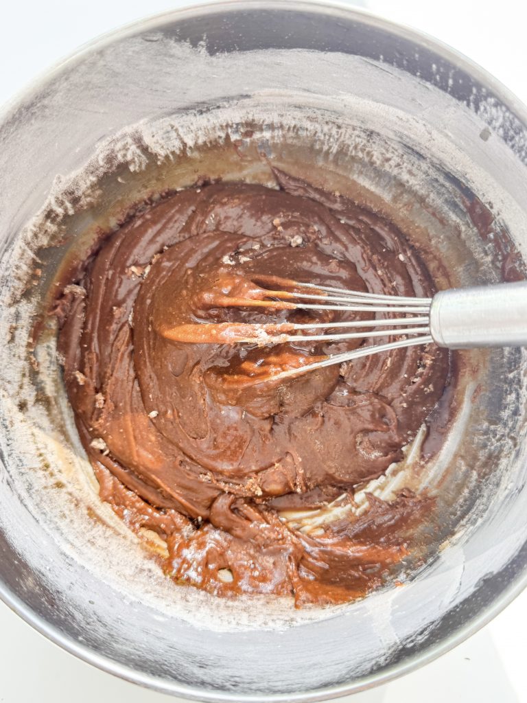 Meanwhile, combine the milk and bicarbonate of soda and pour into the cake batter. Use a balloon whisk to make sure there are no lumps in the mix.