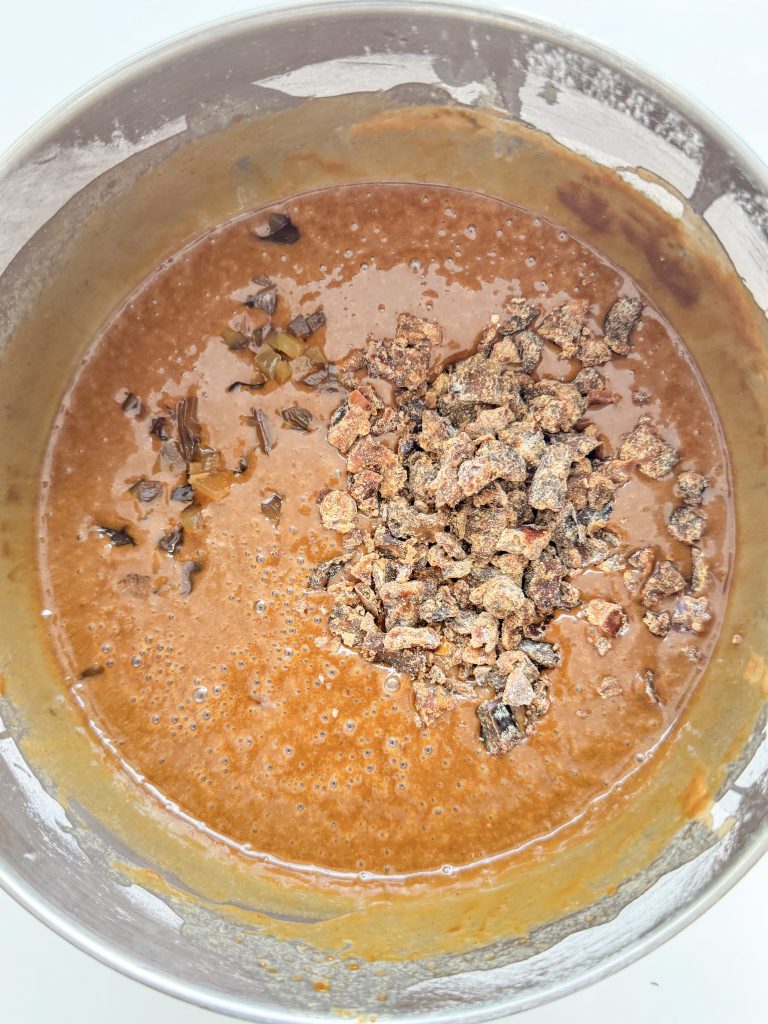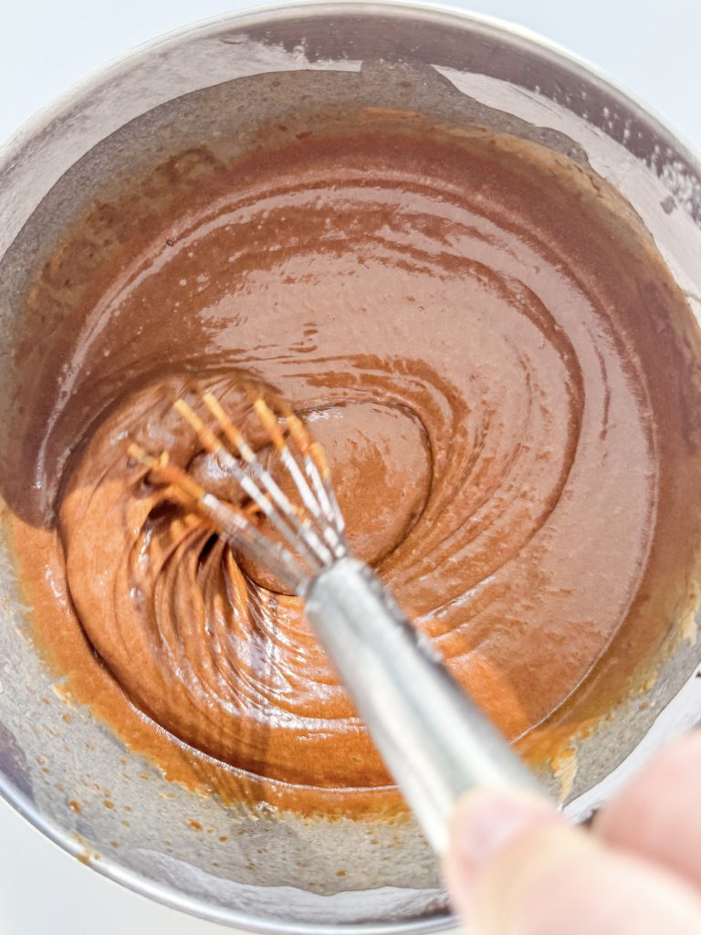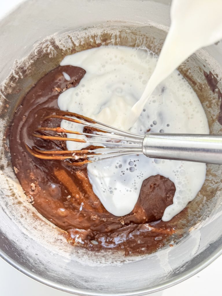- Meanwhile, combine the milk and bicarbonate of soda and pour into the cake batter. Use a balloon whisk to make sure there are no lumps in the mix.