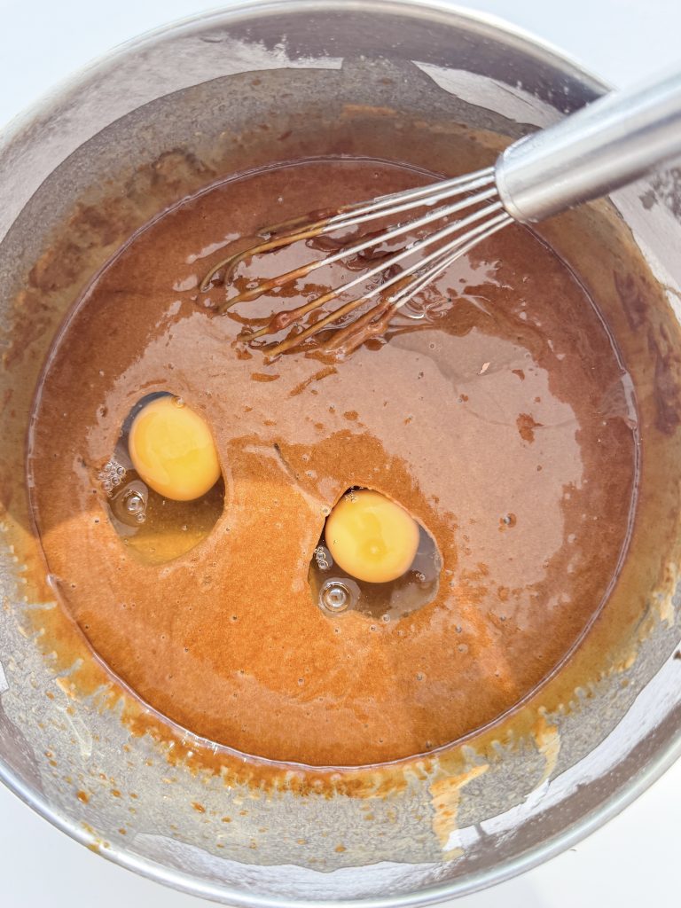 - Crack in the eggs and mix everything together thoroughly with a balloon whisk.